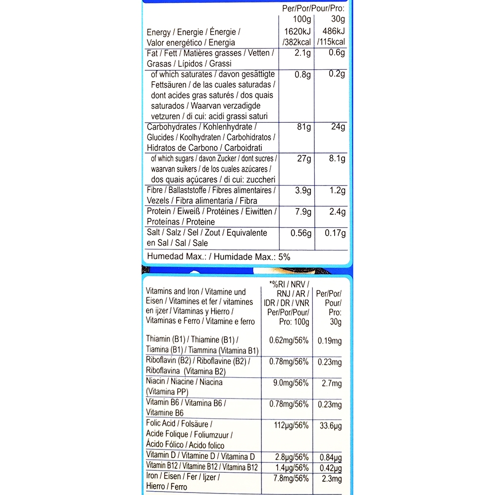 Cereal Flours (66%) (WHEAT, Rice), Sugar, Fat Reduced Cocoa Powder, Oreo Crumb (2.8%) (WHEAT Flour, Sugar, Rapeseed Oil, Fat Reduced Cocoa Powder, Glucose Fructose Syrup, WHEATStarch, Raising Agents (Potassium Carbonate, Ammonium Carbonate, Sodium Carbonate), Palm Oil, Salt, Emulsifier: SOYA, Lecithin, Flavouring), WHEAT Starch,FlavouringsSaltNiacinIronRiboflavin (B2)Vitamin B6Thiamin (B1)Folic AcidVitamin DVitamin B12