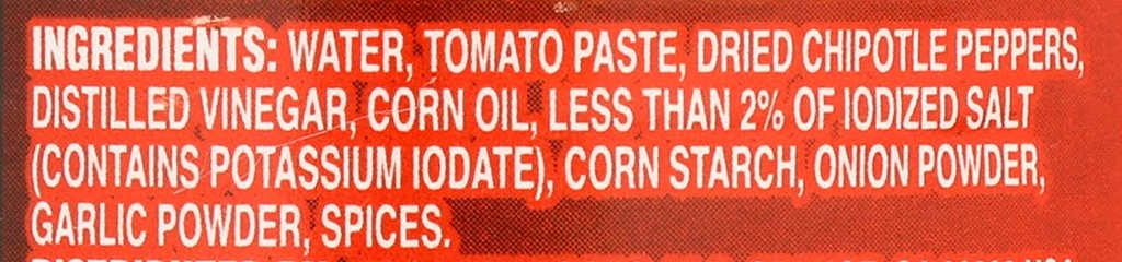 Nước, bột cà chua, ớt Chipotle khô, giấm chưng cất, dầu ngô, ít hơn 2% muối iốt (chứa kali iodat), tinh bột ngô, bột hành, bột tỏi, gia vị.